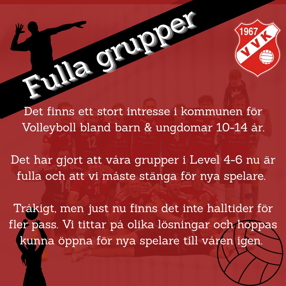 Tyvärr så behöver vi stänga Level 4-6 för nya spelare. Våra grupper är överfulla och intresset för Volleyboll bara ökar. Som det ser ut nu har vi inte fler halltider att använda vilket gör att vi måste stoppa för fler spelare, detta för att kunna hålla en bra nivå och fortsatt utvecklande träningar.